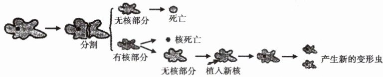 14. 用一根玻璃针将一个变形虫(变形虫身体只有一个细胞)切为两半,有核的一半能继续生活,无核的一半死亡。如果将一个变形虫的核取出,无核的部分能短期生存,但不能繁殖后代,单独的细胞核则不能生活。如果在去核后的第3天,再重新植入一个细胞核,则这个变形虫能正常生活。如下图所示,据图回答问题: