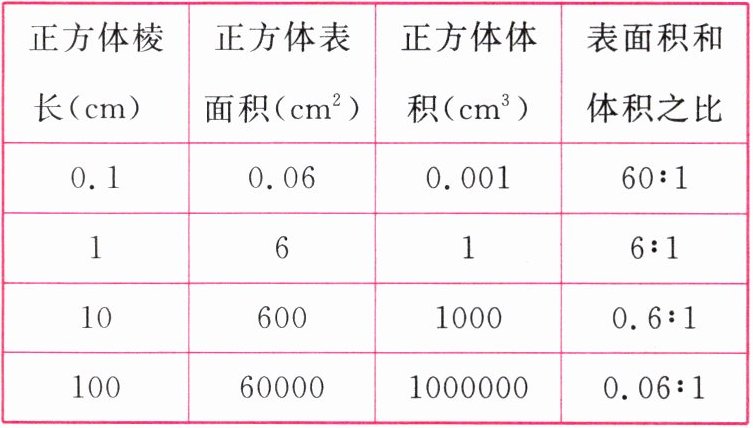|正方体棱长(cm)|正方体表面积($cm^{2}$)|正方体体积($cm^{3}$)|表面积和体积之比|