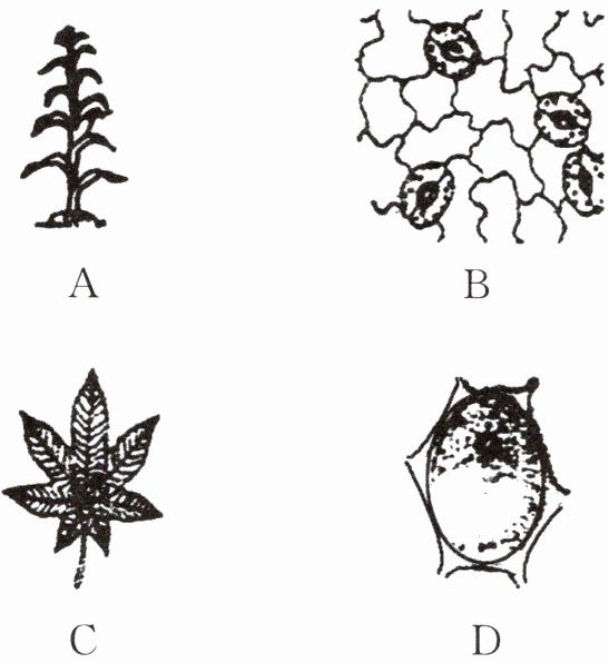 C 点拨:解答本题的关键是正确理解器官的概念和认识图中的结构。器官是由不同组织按一定顺序形成的具有一定功能的结构。分析图示,A是一株完整植物体,B是叶的表皮,是保护组织,C是叶片,是由保护组织、薄壁组织、输导组织等构成的器官,D是一个植物细胞。故选C。