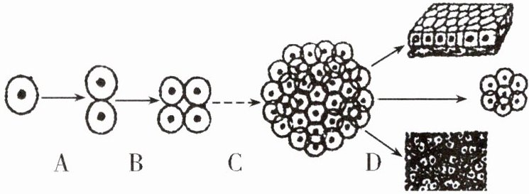 D 点拨:D过程细胞的形态发生了明显的变化,是细胞分化的过程,细胞分化的结果是形成各种不同的组织。保护组织是由一群排列紧密的细胞组成的。A、B、C都是细胞分裂的过程,一个细胞分裂变成两个细胞,分裂的结果是使细胞数目增多。