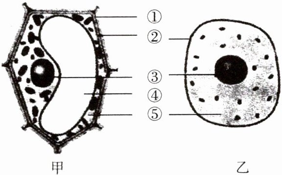(1)制作人的口腔上皮细胞临时装片时,在载玻片上滴加生理盐水,可起到保持细胞形态的作用;图甲细胞中有细胞壁、液泡等结构而图乙中没有,故图甲是植物细胞,图乙是动物细胞,显微镜下观察到的人的口腔上皮细胞结构与图乙相似。
