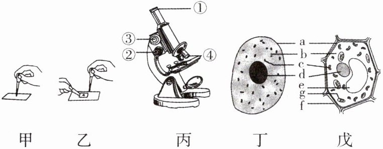 26. (眉山)图中,甲、乙表示“制作人的口腔上皮细胞临时装片或制作洋葱鳞片叶内表皮细胞临时装片”实验的部分操作步骤;图丙表示单目显微镜的结构;图丁、戊分别为动物细胞、植物细胞结构的模式图。回答下列问题。