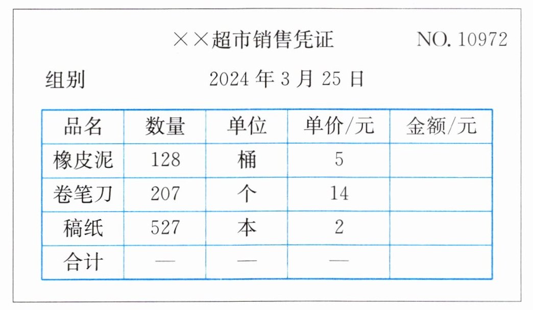 六、下面是一张购买文具的收据,请填出相应的金额。(用计算器计算)