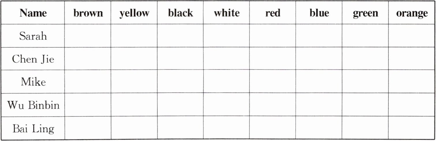 Ⅵ. Listen and tick. (听录音,勾出“√”各人所喜欢的颜色。)