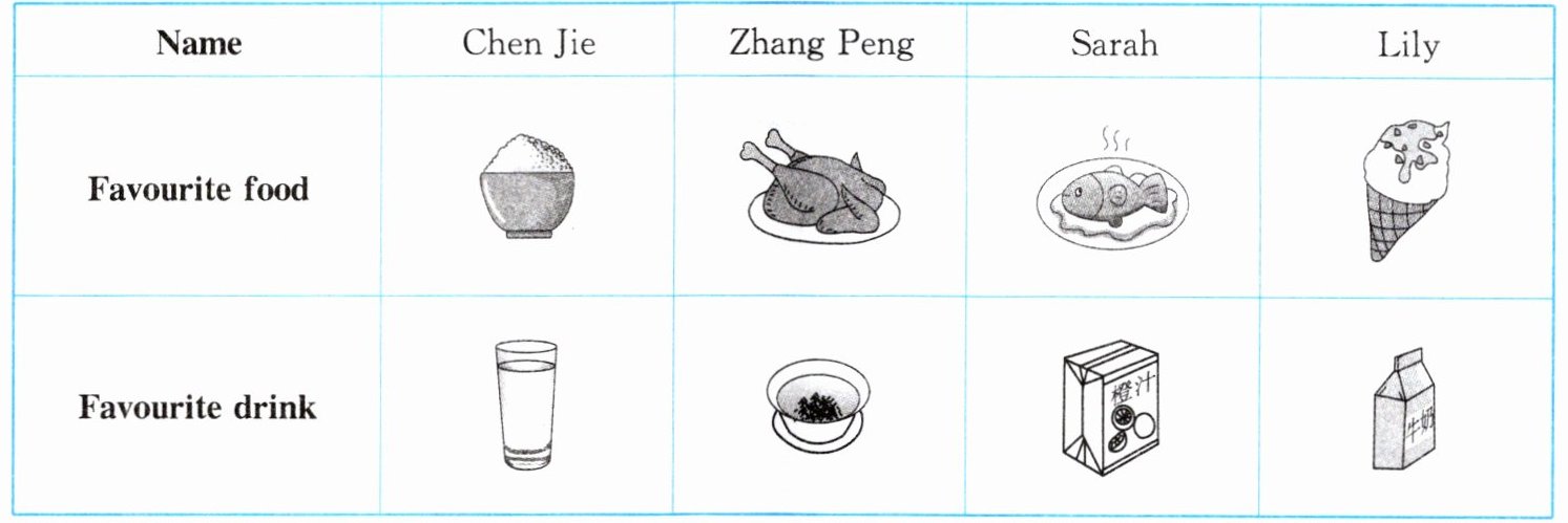 1. Zhang Peng's favourite food is chicken. His favourite drink is tea. 2. Sarah's favourite food is fish. Her favourite drink is orange juice. 3. Lily's favourite food is ice cream. Her favourite drink is milk.