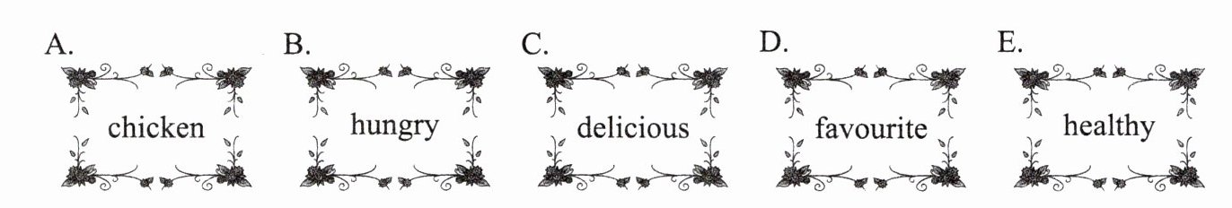 A. chicken B. hungry C. delicious D. favourite E. healthy