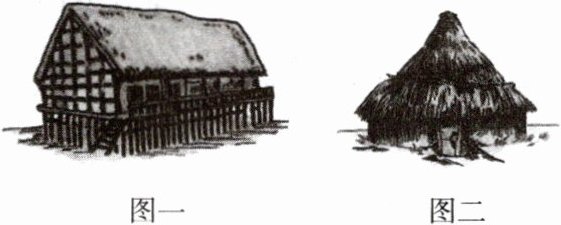 1. 图一是干栏式建筑,河姆渡人生活在长江中下游地区,地势低洼、气候温暖潮湿,干栏式房屋利于通风、防潮、防虫蛇。图二是半地穴式房屋,半坡人生活在黄河流域,这里干旱、风沙大,气候比较寒冷,半地穴式房屋既可以抵挡风沙,又可以取暖,冬暖夏凉。