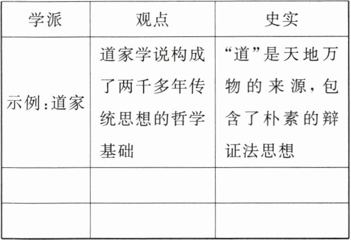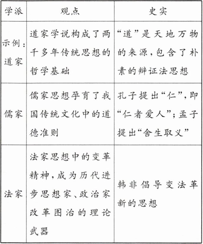 探究2:参照示例,先从材料二中选取任意一个观点(道家除外),然后从材料三中选择对应的史实加以印证。