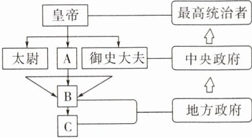 (2)材料二是秦朝专制主义中央集权制度结构示意图,请结合所学知识填写A、B、C三处的内容。