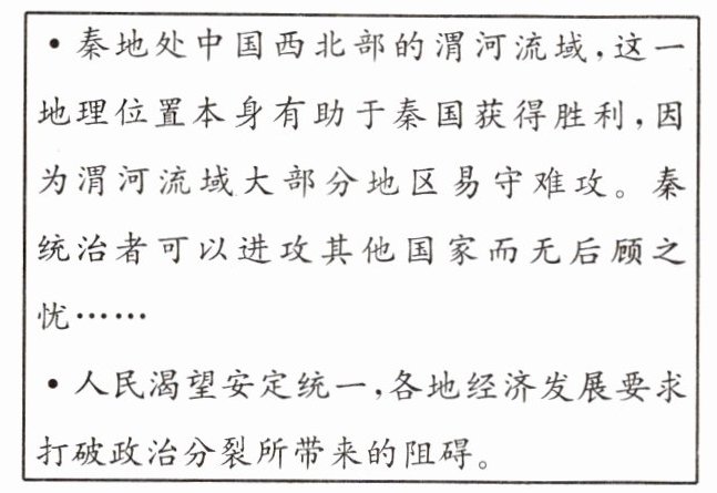 (1)条件:秦国地理位置优越,易守难攻;长期战乱给社会带来巨大灾难,人民渴望安定统一。