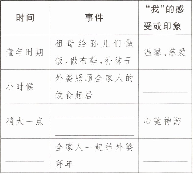 | 小时候 | 外婆照顾全家人的饮食起居 | ______ |