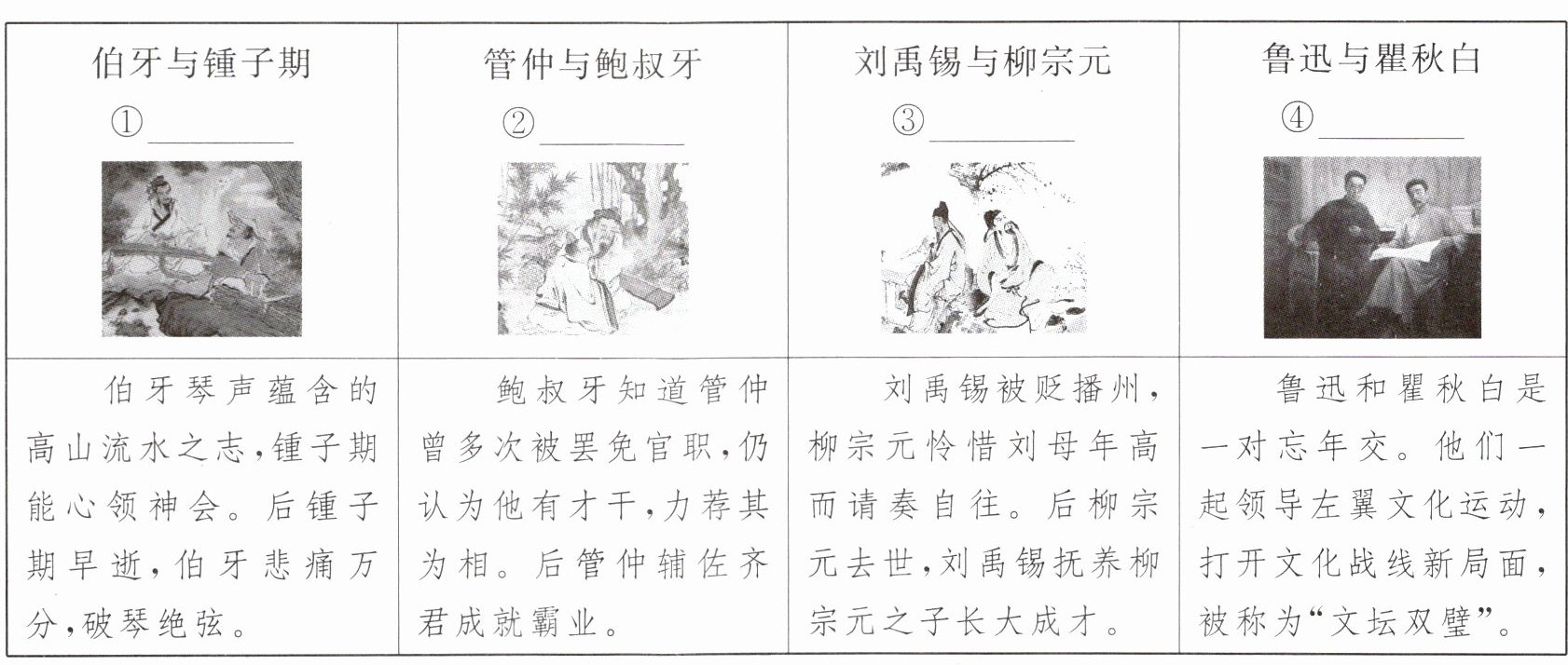 | 伯牙琴声蕴含的高山流水之志,锺子期能心领神会。后锺子期早逝,伯牙悲痛万分,破琴绝弦。 | 鲍叔牙知道管仲曾多次被罢免官职,仍认为他有才干,力荐其为相。后管仲辅佐齐桓公成就霸业。 | 刘禹锡被贬播州,柳宗元怜惜刘母年高而请奏自往。后柳宗元去世,刘禹锡抚养柳宗元之子长大成才。 | 鲁迅和瞿秋白是一对忘年交。他们一起领导左翼文化运动,打开文化战线新局面,被称为“文坛双璧”。 |
