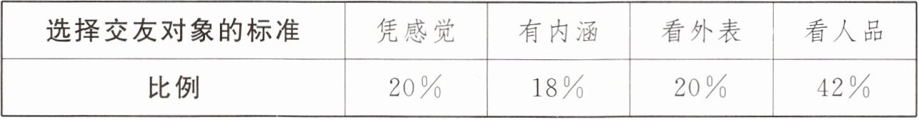 | 选择交友对象的标准 | 凭感觉 | 有内涵 | 看外表 | 看人品 |