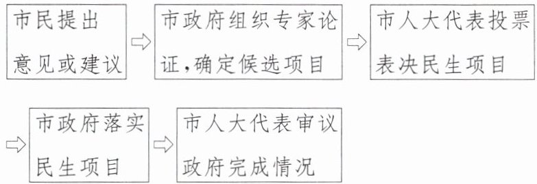 |市民提出意见或建议|→|市政府组织专家论证,确定候选项目|→|市人大代表投票表决民生项目|→|市政府落实民生项目|→|市人大代表审议政府完成情况|