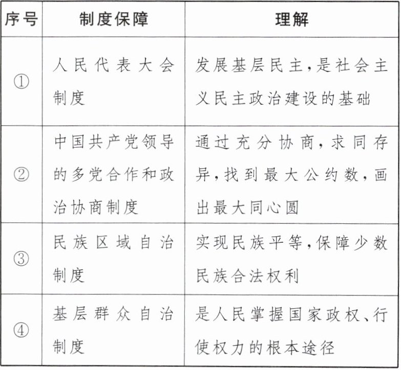 |②|中国共产党领导的多党合作和政治协商制度|通过充分协商,求同存异,找到最大公约数,画出最大同心圆|