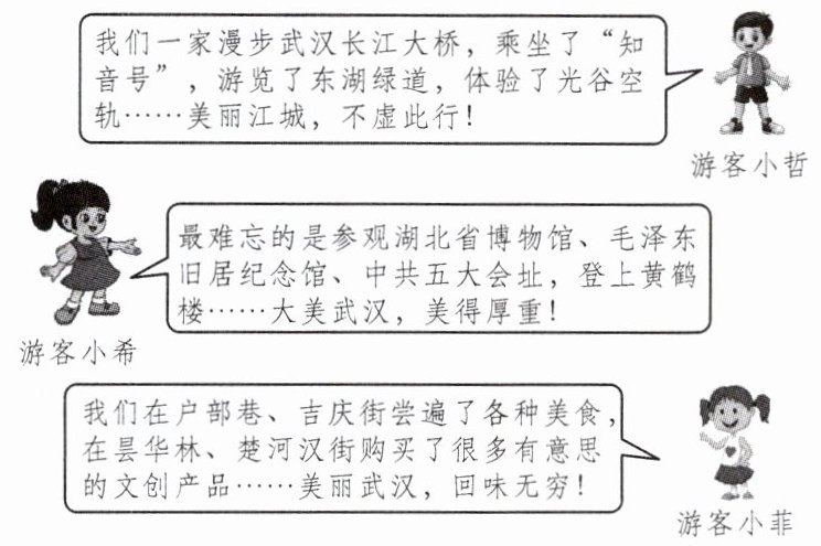 ①武汉长江大桥体现了武汉的桥梁文化之美。②黄鹤楼、湖北省博物馆体现了传统文化之美。③东湖绿道体现了绿色之美(人与自然和谐共生之美)。④光谷空轨体现了创新之美。⑤毛泽东旧居纪念馆、中共五大会址体现了革命文化之美。⑥户部巷体现了美食文化之美。⑦文创产品体现了文化与创新融合之美。(答出三个角度、言之有理即可,6 分)