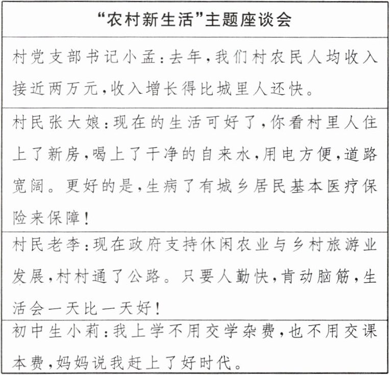 (2)从他们的话语中,你感受到我国农村发生了哪些巨大变化?(4 分)