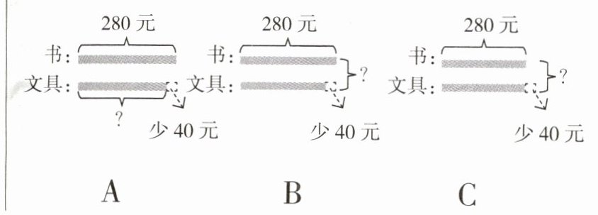 (4)小明买书花了280元,买文具比买书少花40元,小明一共花了多少钱?下列示意图能正确表示题意的是(