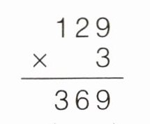 $\begin{array}{r} 129\\ ×\ \ \ 3\\ \hline 369\end{array} $ $(×)$