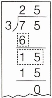 $\begin{array}{r} 25 \\ 3 \enclose{longdiv}{75} \\ \underline{6} \\ 15 \\ \underline{15} \\ 0 \end{array} $