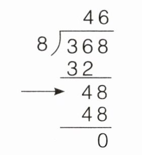 (2)上一步除完后余数为$4$,把被除数个位上的$8$落下来,组成$48$,$48÷8 = 6$,商$6$写在个位上,所以箭头所指的“$48$”表示$48$个一。