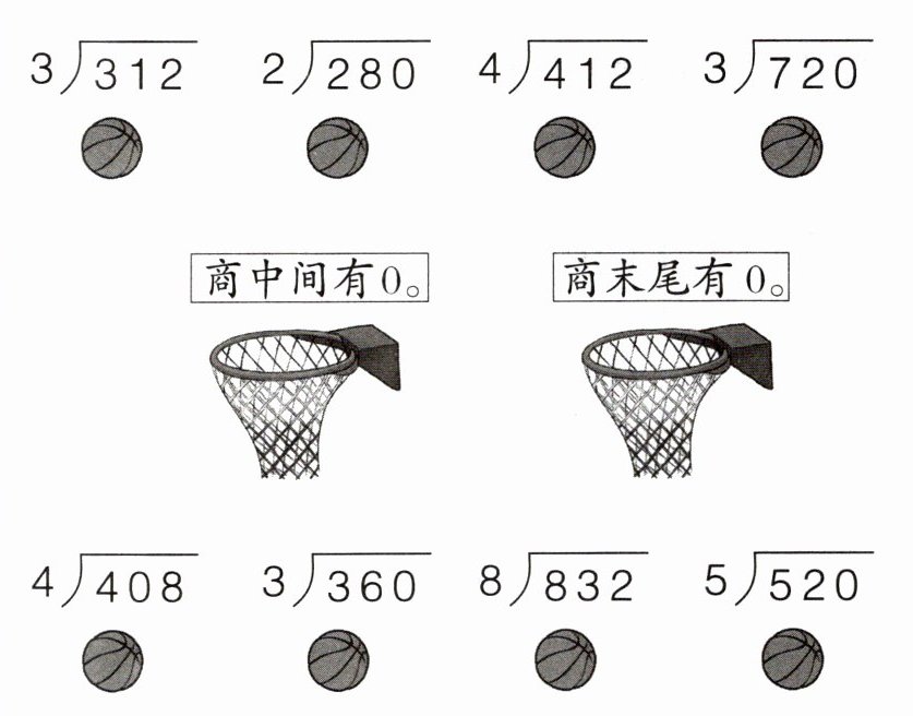 解析:题目要求用竖式计算四个除法算式,这些算式涉及到商末尾有0的情况,属于三年级数学上册中除法的相关内容,需要用竖式计算的方法来求解。