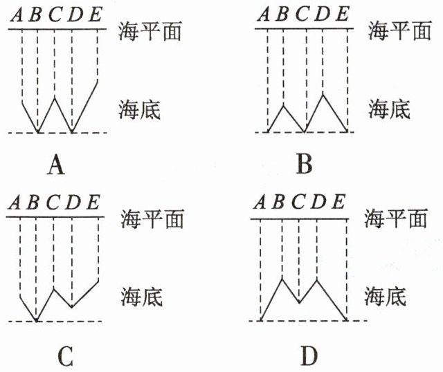 一艘科考船行驶在某海域,并对该海域的海底形状利用声呐系统进行了测绘.具体方法如下:在经过该海域水平面等间距的A、B、C、D、E5个位置时,向海底定向发射超声波,测得回收信号的时间分别为0.30s、0.16s、0.30s、0.14s、0.30s.根据时间,求出海底与海平面的距离,就可以绘出海底的大致形状,则该海域海底的大致形状如图中的(