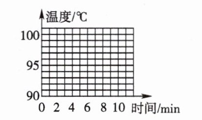 . 当水温接近$90\space {}^{\circ }C$时,每隔$1\space min$记录一次水的温度,在图中作出水沸腾时温度和时间关系的曲线. 分析现象和图像,得出结论.|时间/min|0|1|2|3|4|5|6|7|8|