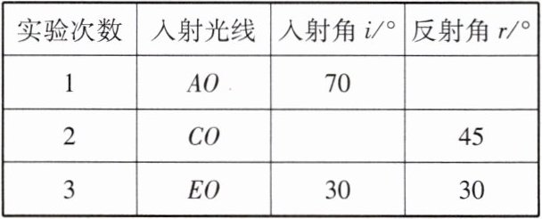 |实验次数|入射光线|入射角$i/^{\circ}$|反射角$r/^{\circ}$|