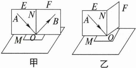 的反射,沿$OB$射出,在纸板上描出入射光线$AO和反射光线OB$的径迹. 如图乙所示,把纸板$NOF$向后或向前折,在纸板上将不能