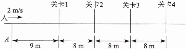 1. (镇江中考)如图所示,电视节目中“闯关游戏”的笔直通道上每隔 $ 8 m $ 设有一个关卡,各关卡同步放行和关闭,放行和关闭时间分别为 $ 5 s $ 和 $ 2 s $. 当小强正通过关卡 $ 1 $ 左侧 $ 9 m $ 远的 $ A $ 处时,关卡刚好放行. 若他全程以 $ 2 m/s $ 的速度做匀速直线运动,则最先挡住他前进的关卡是(