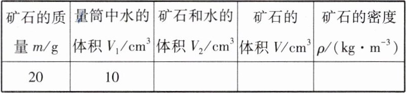 |矿石的质量$m/g$|量筒中水的体积$V_1/cm^3$|矿石和水的体积$V_2/cm^3$|矿石的体积$V/cm^3$|矿石的密度$\rho/(kg \cdot m^{-3})$|