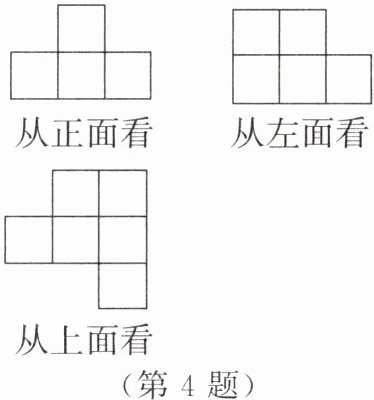4. 在一个仓库里堆积着若干正方体形的货箱,要搬运这些货箱很困难,可是仓库管理员要清点一下货箱的数量,于是就想出一个办法,将从正面、左面、上面看这堆货箱得到的平面图形画了出来,如图所示。你能根据这三个图形帮他清点一下货箱的数量吗?