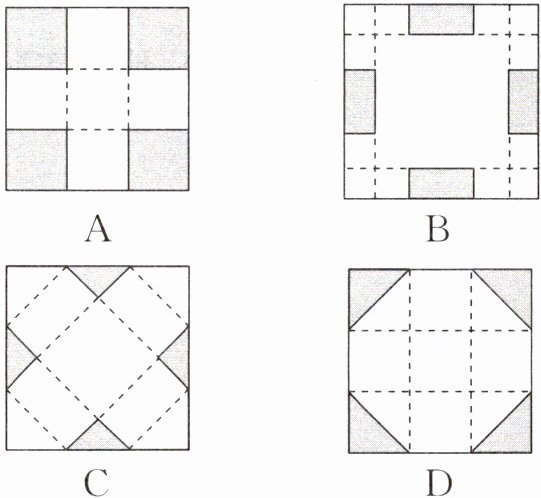 2. 下列四张正方形硬纸片,剪去阴影部分后,如果沿虚线折叠,可以围成一个封闭的长方体包装盒的是(
