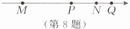 8. 如图,四个有理数在数轴上的对应点分别为$M$,$P$,$N$,$Q$。若点$M$,$N$表示的有理数互为相反数,则图中的点表示的数中,绝对值最小的是(