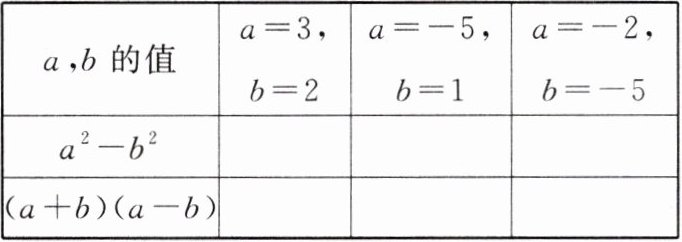 14. 【综合与实践】(1)当 $ a $,$ b $ 取不同数值时,计算 $ a^{2} - b^{2} $ 及 $ (a + b)(a - b) $ 的值,并将计算结果填入下表。