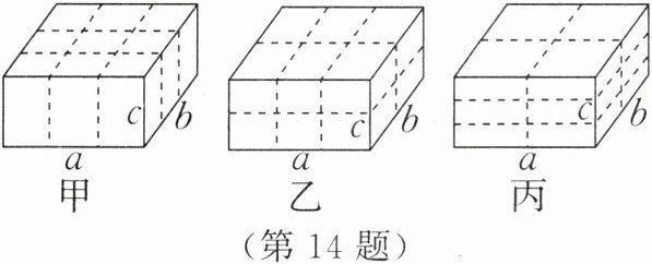 14. 【数学应用】有一个长方体形状的物体,它的长、宽、高分别为 $ a $,$ b $,$ c $($ a > b > c $)。现有三种不同的捆扎方式(如图所示的虚线),哪种方式用绳最少?哪种方式用绳最多?请说明理由。