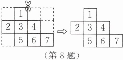 8. 如图,将4×3的网格图剪去5个小正方形后,还剩下7个小正方形,为了使余下的部分(小正方形之间至少要有一条边相连)恰好能折成一个正方体,需要再剪去1个小正方形,则应剪去的小正方形的编号是(
