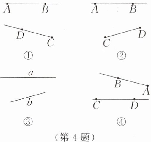 4. 如图,下面分别是线段、射线和直线所组成的图形,能相交的图形有(