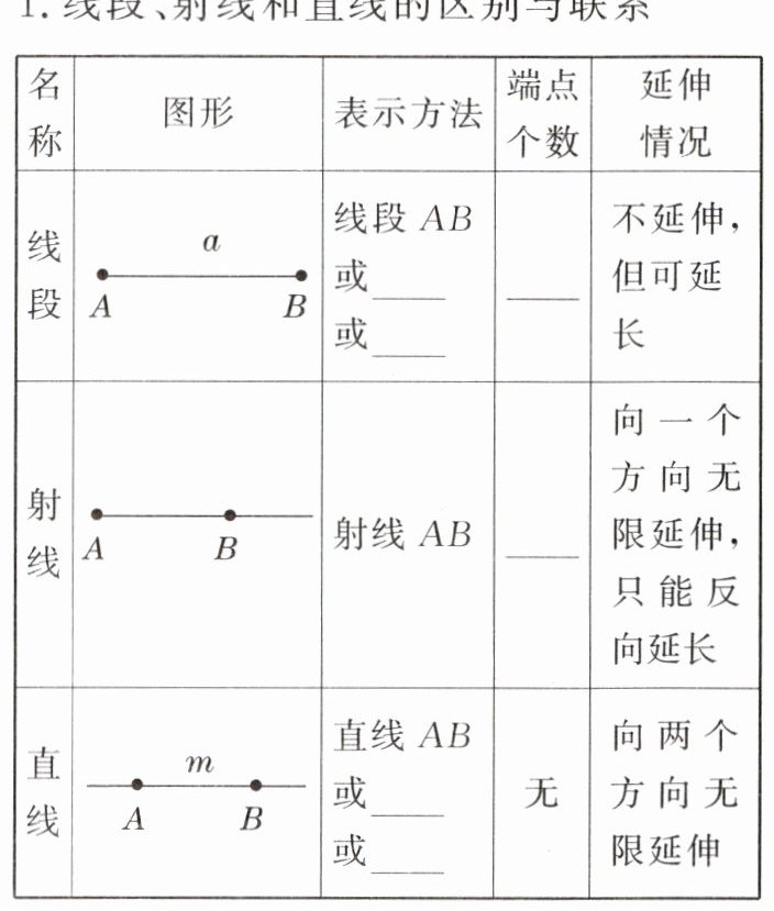 |无|向两个方向无限延伸|2. 直线的基本性质