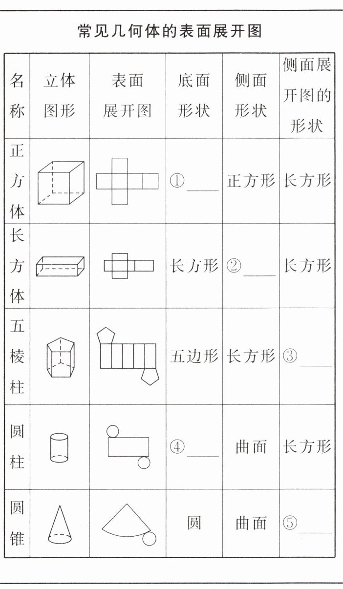 |曲面|长方形||圆锥|||圆|曲面|⑤
