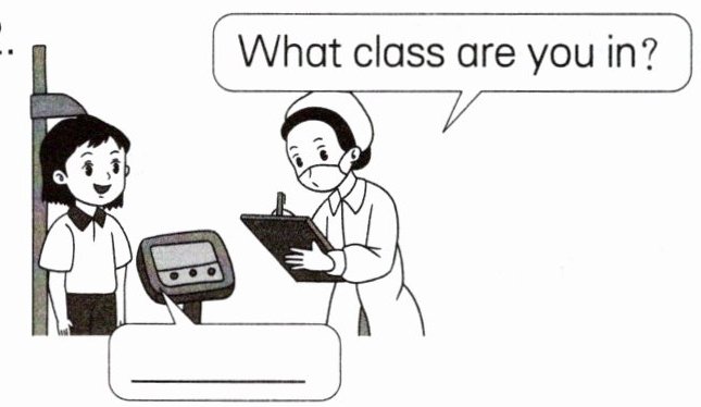 2. 第二幅图中,医护人员问“What class are you in?”,询问所在班级,回答应该是“I'm in Class 1.”,所以第二空选B。