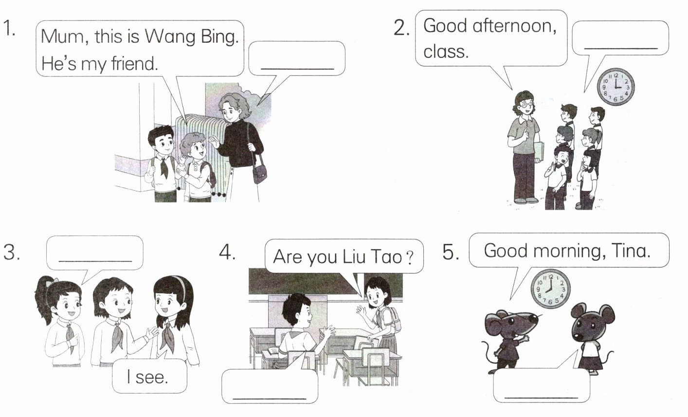 1. 第一幅图中,Wang Bing向妈妈介绍自己的朋友,妈妈应该回应介绍的内容,C选项“Hello, Wang Bing.”(你好,王兵。)符合。