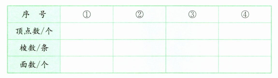观察上表,想一想:多面体的顶点数、棱数、面数之间有什么关系?如果用字母 V 表示顶点的个数,E 表示棱的条数,F 表示面的个数,这个规律可以怎样表示?______