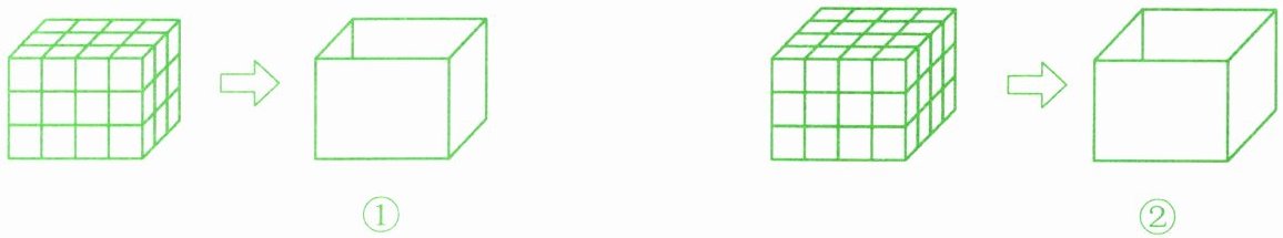 容器①由$3×3×3 = 27$个1立方厘米的正方体木块摆成,其体积为27立方厘米。