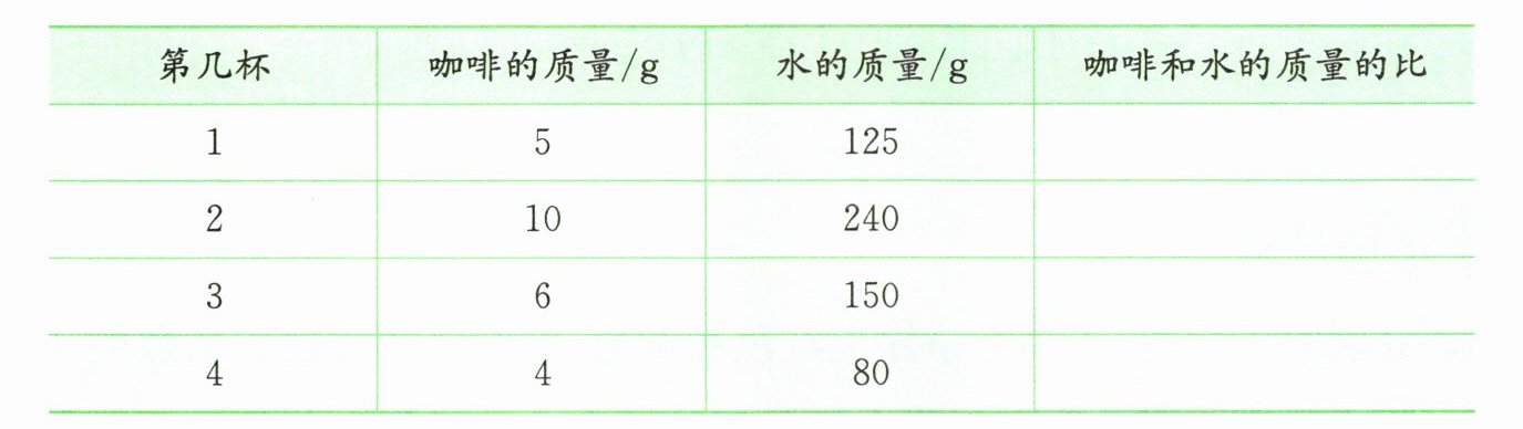 5. 写出每杯咖啡中咖啡和水的质量的比,并化简。