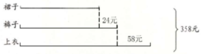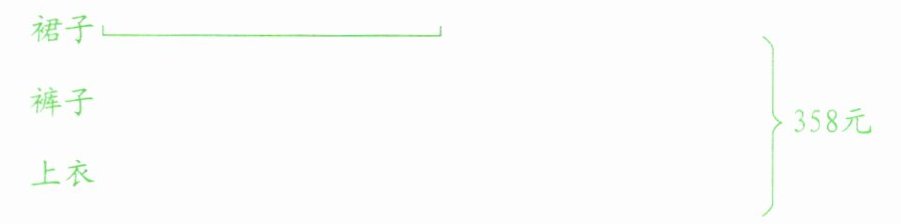 3. 王阿姨在百货商店买了一件上衣、一条裤子和一条裙子,一共花了358元。已知上衣比裤子贵58元,裤子比裙子贵24元,你能算出上衣、裤子和裙子各多少元吗?(先把下面的线段图补充完整,再解答)