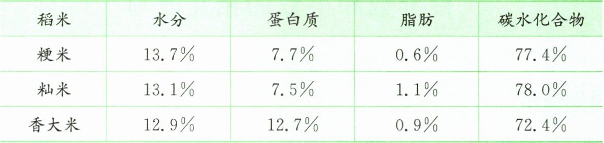 5. 按质量算,几种稻米中水分、蛋白质、脂肪、碳水化合物的含量如下表。