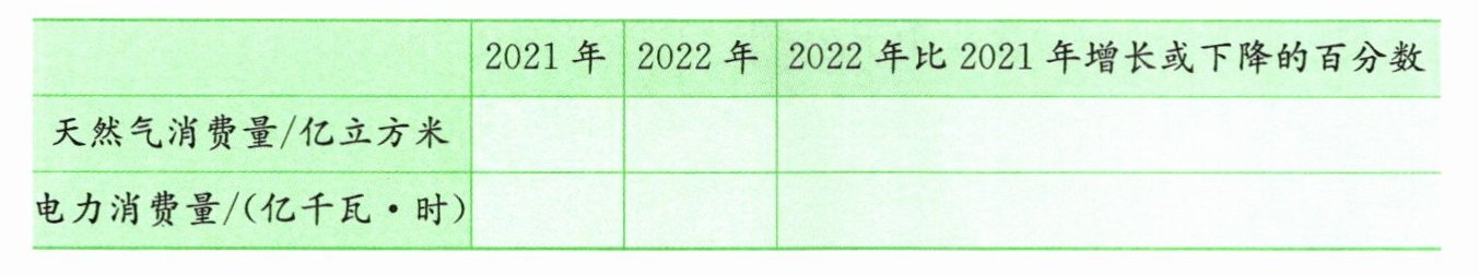 4. 2021年,我国生活能源中天然气消费量是592亿立方米,电力消费量是12279亿千瓦·时;2022年,我国生活能源中天然气消费量是589亿立方米,电力消费量是13936亿千瓦·时。把下面的表格填写完整。(用计算器计算)