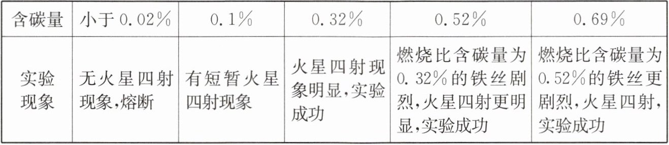 | 实验现象 | 无火星四射现象,熔断 | 有短暂火星四射现象 | 火星四射现象明显,实验成功 | 燃烧比含碳量为0.32%的铁丝剧烈,火星四射更明显,实验成功 | 燃烧比含碳量为0.52%的铁丝更剧烈,火星四射,实验成功 |
